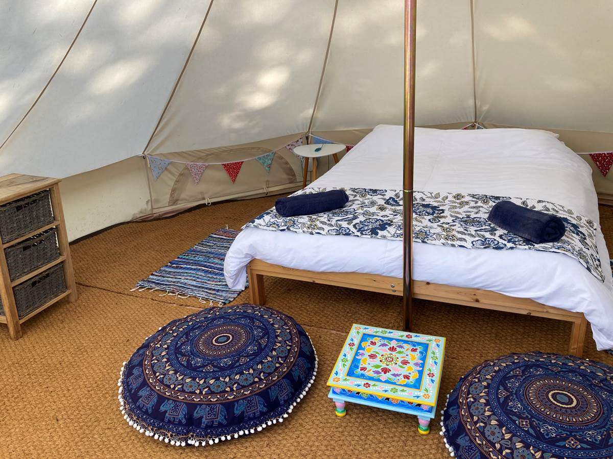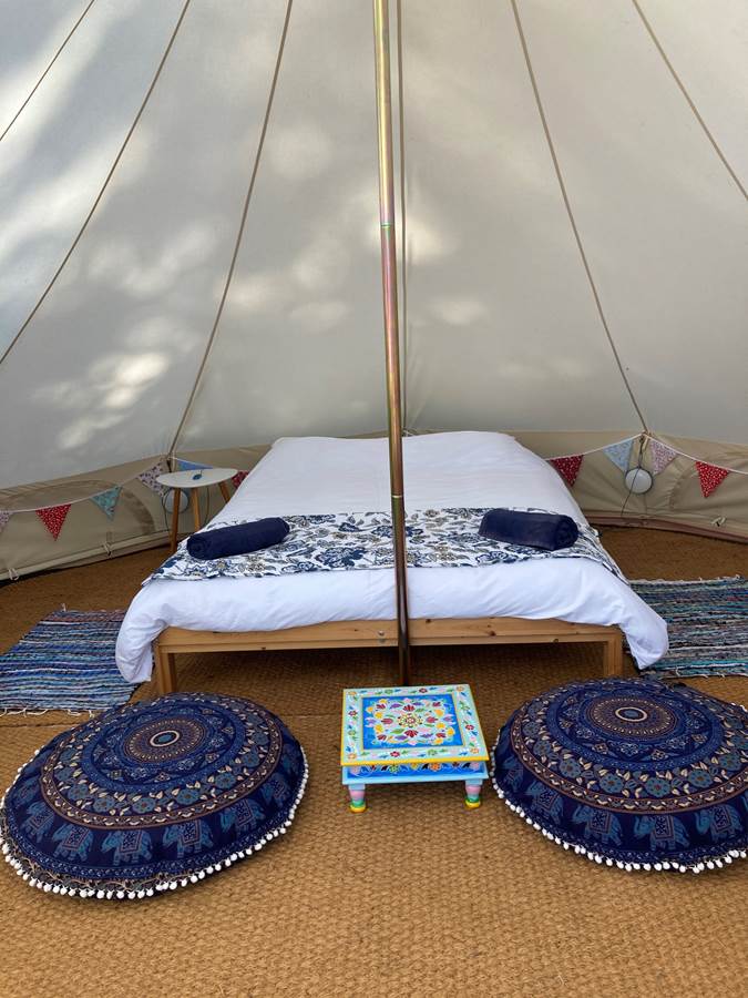 Une tente cloche traditionnelle en toile, parfaite pour deux personnes, mais avec suffisamment d'espace pour un petit enfant sur un lit de camp si vous le souhaitez. Le Bleuet dispose d'un lit double, d'un coin salon avec coussin de sol et d'une ambiance festivalière indéniable. Chaque tente est équipée de draps 100 % coton, d'un éclairage solaire et de couvertures pour le coucher du soleil. Vous disposerez d'une salle de bain écologique privée avec douche solaire et toilettes à compostage. Vous disposerez de votre propre espace de cuisson en plein air avec équipement et barbecue à gaz. Dans notre hangar alimenté par le réseau électrique, vous trouverez un réfrigérateur, un congélateur et une petite épicerie, ainsi que de quoi faire du café et du thé.